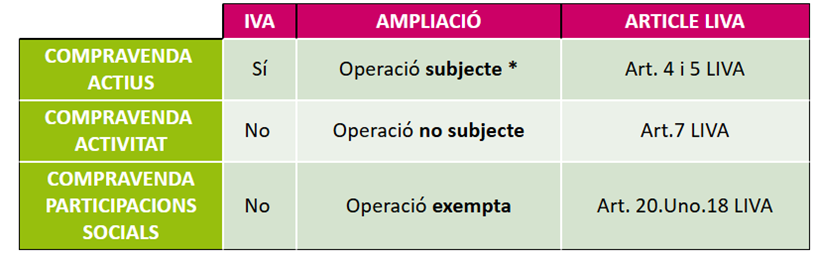 Per tant, en la situació inicial ens trobaríem davant d’una compravenda d’actius, gravada amb l’IVA i, en el segon cas, ens trobaríem davant d’una compravenda d’activitat que no estaria subjecte a l’IVA.