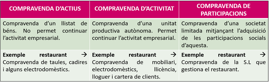A mode d’exemple, podríem parlar de la transmissió d’un restaurant. Si la compravenda inclogués unes taules, cadires i alguns electrodomèstics, per si mateixos, aquests béns no ens permetrien desenvolupar una activitat de restauració. En canvi, si se’ls afegeix la transmissió d’una llicència d’activitat, un lloguer d’un local, i una cartera de proveïdors i clients, sí que podríem desenvolupar una activitat de restauració com a tal.